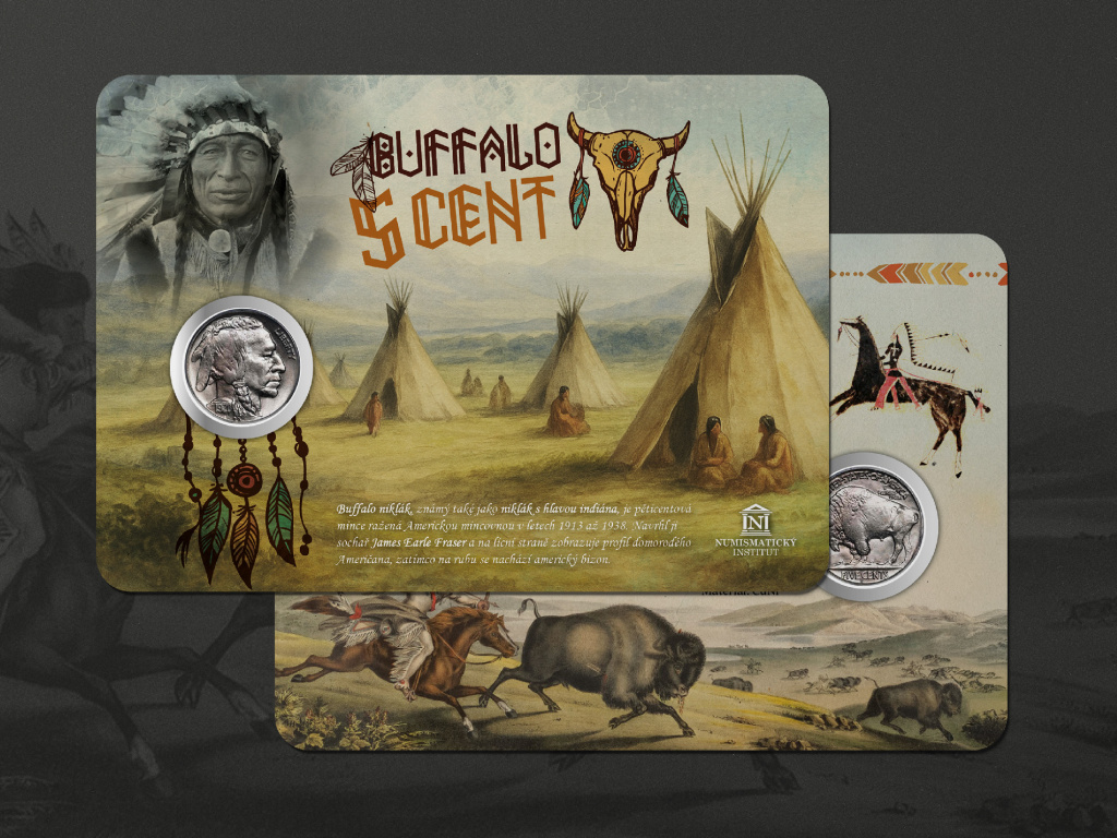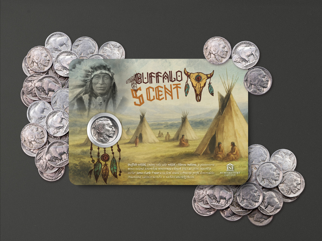 Americký pěticent z let 1913–1938, známý jako Buffalo nickel, patří k nejikoničtějším mincím Spojených států. Na jedné straně nese portrét indiánského náčelníka složený z rysů několika skutečných osobností, na straně druhé mohutného bizona – symbol svobody a síly amerických plání. Mince vznikla v době, kdy Divoký západ pomalu mizel v dějinách, ale jeho duch zůstával živý v paměti lidí. Tato kartička vás přenese do éry, kdy kovbojové, indiáni a otevřené prérie utvářely obraz Ameriky.