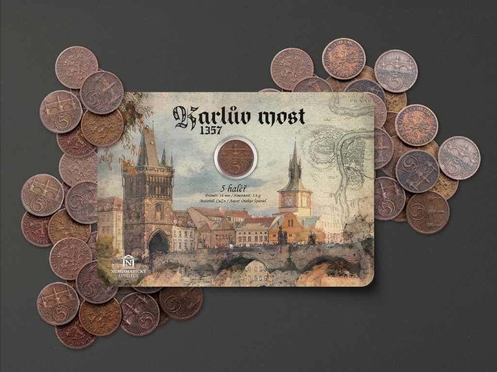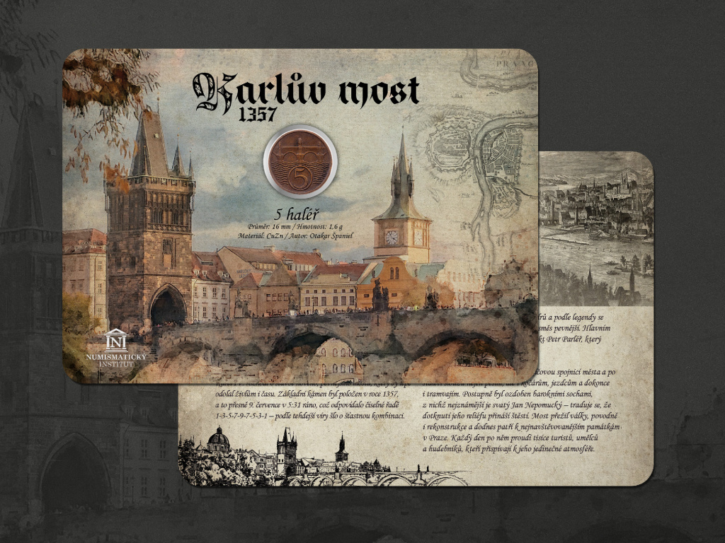 Vydejte se zpět do středověké Prahy a připomeňte si vznik jedné z nejznámějších českých památek – Karlova mostu. Jeho stavbu zahájil císař Karel IV. v roce 1357 a dodnes patří k nejnavštěvovanějším symbolům naší historie. Tato numismatická kartička nese originální dobovou minci 5 haléř s motivem mostu, díky níž držíte v ruce skutečný kousek minulosti.